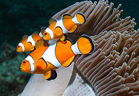 Clownfish lay eggs on any flat surface close to their host anemones. In the wild, clownfish spawn around the time of the full moon and the male parent guards them until they hatch about 6 to 10 days later, typically 2 hours after dusk. Clownfish are omnivorous: in the wild they eat live food such as algae, plankton, molluscs, and crustacea; in captivity they can survive on live food, fish flakes, and fish pellets. They feed mostly on copepods and mysids, and undigested food from their host anemones. Depending on the species, clownfish can lay hundreds or thousands of eggs. Clownfish were the first type of marine ornamental fish to be successfully bred in captivity on a large scale. It is one of a handful of marine ornamentals whose complete life cycle has been successfully completed in captivity. A Similans liveaboard is a great place to go to see hundreds of types of fish and the variety of clown fish will I am sure amaze even the most experienced diver.