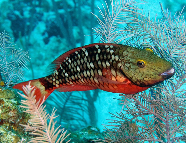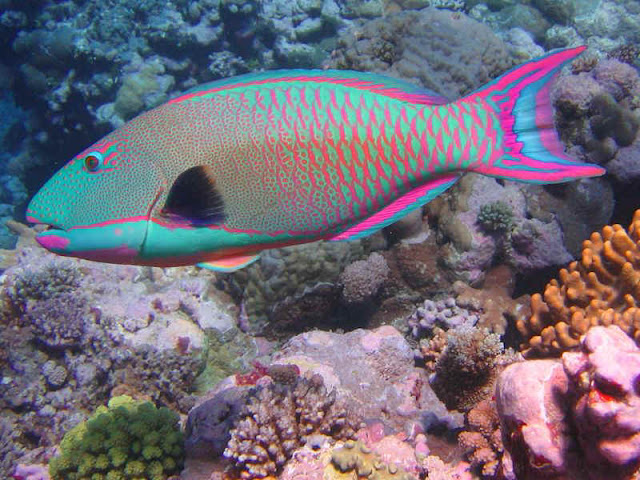 The development of parrot fish is complex and accompanied by a series of changes in color termed polychromatism. For most species, adult males and females have different color, the females usually displaying drab tones of green, brown or gray, and the males a vivid, neon color. In the Mediterranean parrotfish (Sparisoma cretense), it is the females that have neon color with the males being a drab gray. ParrotfishIn most species, the juveniles have a different color pattern than the adults and some tropical species this juvenile coloration can be altered temporarily to mimic the appearance of other species. As the juveniles mature they enter what is termed the initial phase coloration during which they may change color and gender. For most species, initial phase fish are usually males that have the beginnings of the adult male coloration. However, initial phase fishes may include generally mature females. The many varieties of color the parrot fish has presented to us are all part of the many phases the parrot fish goes through. Feeding parrot fish of most tropical species form large schools grouped by size. Fights of several females presided over by a single male are the normal in most species, the males vigorously defending their position at any challenge. If the dominant male of a school is removed, one of the females will change gender and adopt the dominant male role. Parrot fish are pelagic spawners; that is, they release many tiny buoyant eggs into the water which become part of the plankton. The eggs float freely, settling into the coral until hatching.