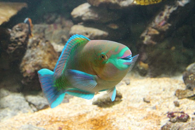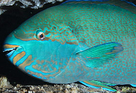 Parrot fish are named for their dentition; their numerous teeth are arranged in a tightly packed mosaic on the external surface of the jaw bones, forming a parrot-like beak which is used to rasp algae from coral and other rocky substrates (a process called bioerosion). Many species are also brightly coloured in shades of blue, green, red and yellow, but are not especially popular as pets. Although they are considered to be herbivores, parrot fish eat a wide variety of organisms, that live on coral reefs. Some species, for example Bolbometopon muricatum may include corals (polyps) in their diet. Their feeding activity is important for the production and distribution of coral sands in the reef biome and can prevent algae from choking coral. The teeth grow continuously, making it hard to curb overgrowth in the aquarium. Ingested during feeding, coral rock is ground up by the pharyngeal teeth. After they digest this it is excreted as sand thus at times creating small islands and the idyllic sandy beaches of the Bahamas and Caribbean. This is quite clear in the tropics too which is what makes aSimilan liveaboard so appealing. One parrot fish can chew coral into 90 kg of sand each year. Maximum sizes do not vary widely within the family, with the majority of species reaching 30 centimeters to 40 centimetres (16 in) in length. However, a very few species, such as the humphead parrot fish , are much larger, up to 100 centimeters. Their bodies are deep, with large, thick cycloid scales, large pectoral fins and homocercal tail fins. The pectorals are the parrot fish's primary means of locomotion, the tail only used when speed is required. Some parrotfish females can turn into male parrot fish.