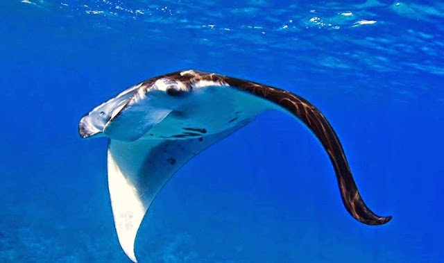 The Manta ray, or cheap manta (Manta birostris), is the largest of the rays, with the largest known specimen having been about 7.6 m (about 25 ft) across, with a weight of about 2,300 kg (about 5,000 lb). It ranges throughout all tropical waters of the world, typically around coral reefs. Mantas have been given a variety of common names, including Atlantic manta, Pacific manta, devilfish, and just manta. Some people just call all members of the family stingrays, though stingrays comprise a separate family of rays (Dasyatidae). Mantas are most commonly black dorsally and white ventrally, but some are blue on their backs. A manta's eyes are located at the base of the cephalic lobes on each side of the head, and unlike other rays the mouth is found at the anterior edge of its head. To respire, like other rays, the manta has five pairs of gills on the underside. To swim better through the ocean, they have a diamond shaped body plan, using their pectoral fins as graceful "wings". Distinctive "horns" (from which the common name Devil ray stems) are on either side of its broad head. These unique structures are actually derived from the pectoral fins. During embryonic development, part of the pectoral fin breaks away and moves forward, surrounding the mouth. This gives the manta ray the distinction of being the only jawed vertebrate to have novel limbs (the so-called six-footed tortoise, Manouria emys, does not actually have six legs–only enlarged tuberculate scales on their thighs that look superficially like an extra pair of hind limbs). These flexible horns are used to direct plankton, small fish and water into the manta's very broad and wide mouth. The manta can curl them to reduce drag while swimming.